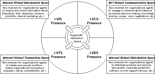 The ICDT model can be used to in this context to describe the new space of opportunities available to companies for increasing the efficiency and effectiveness of organizational agents through the set-up of appropriate Intranet/groupware platforms [Gow 1996]. Again, this spaced of opportunities can be divided into four separate "Virtual Spaces" as illustrated in figure 2.